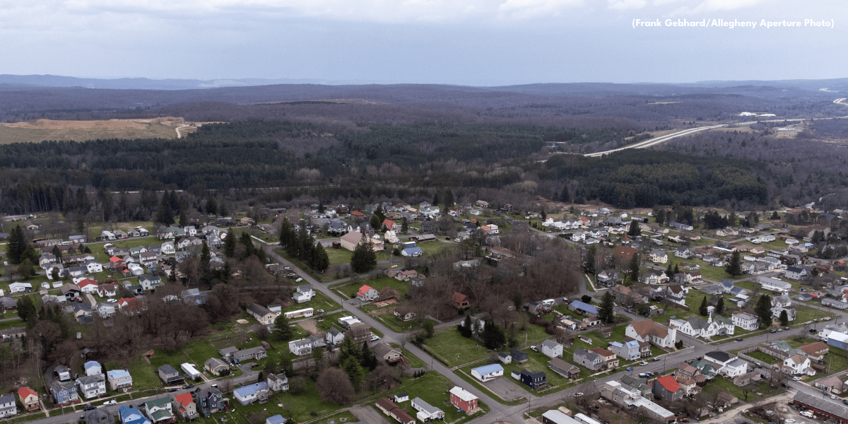 An aerial view of Davis, West Virginia, with the Tucker County Landfill and site of the proposed power plant in the upper left background. (Frank Gebhard/Allegheny Aperture Photo)
