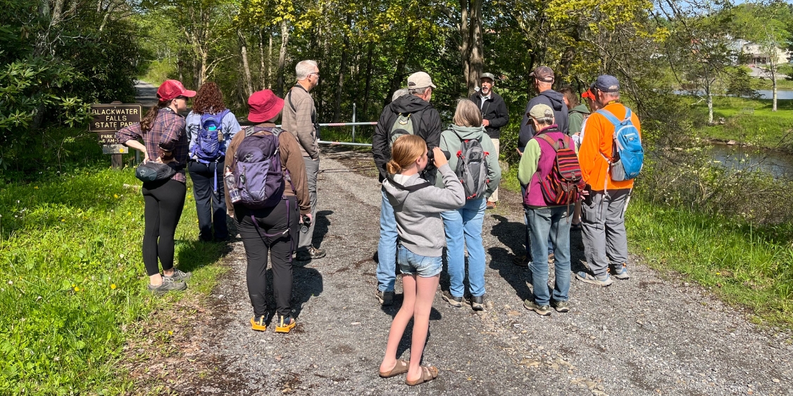 We had a full gaggle of birders for our first outing of the year on May 21 in Davis. On a brisk and breezy Sunday morning, we set out from the Allegheny Trail parking lot and hiked into Blackwater Falls State Park along the Blackwater River. The rain from the previous day made for that scintillating spring combination of moisture and coolness, and we were fortunate that the weather was in full cooperation as the sun was there to warm us up along the way. Our guide was Casey Rucker, an accomplished birder who has recently helped co-edit The Second Atlas of Breeding Birds in WV with WV State Ornithologist Rich Bailey. Casey is also the editor of The Redstart, the scientific publication of Brooks Bird Club.
