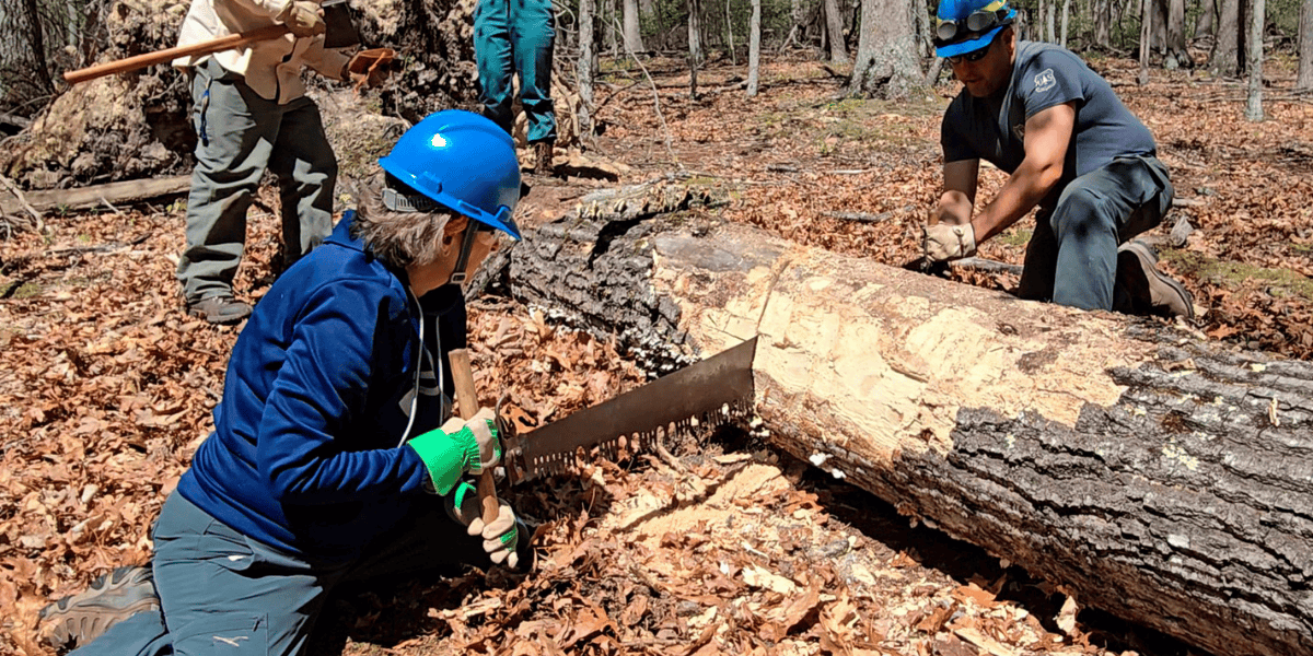In addition to crosscut saws, we use other hand tools to keep the trail clear. Hand saws are more appropriate for smaller branches impinging on the trail and can be carried on even routine hikes. We use single- and double-bit axes for cases where a saw would be unwieldy or potentially damaged. And with loppers we try to regularly cruise the trails to keep the fast-growing rhododendron and laurel at bay. The Crosscut Sawyer team is busy with trail clearing projects throughout the season!