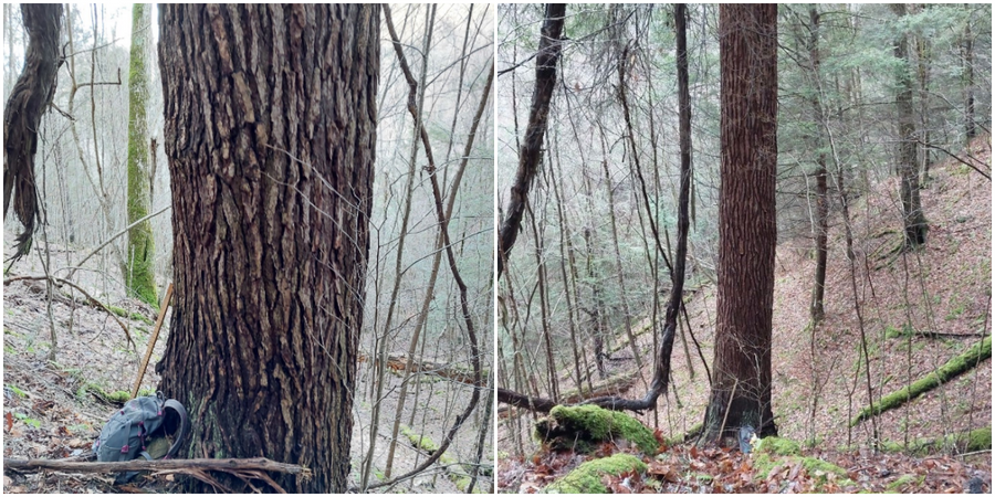 We were gratified to find that 15 of the 221 large trees found this winter were Eastern Hemlocks in stand R45. Stand R45 really is a special place. The champion tree of the winter’s surveys was one of those hemlocks, that we have since learned qualifies as the third largest hemlock in West Virginia.