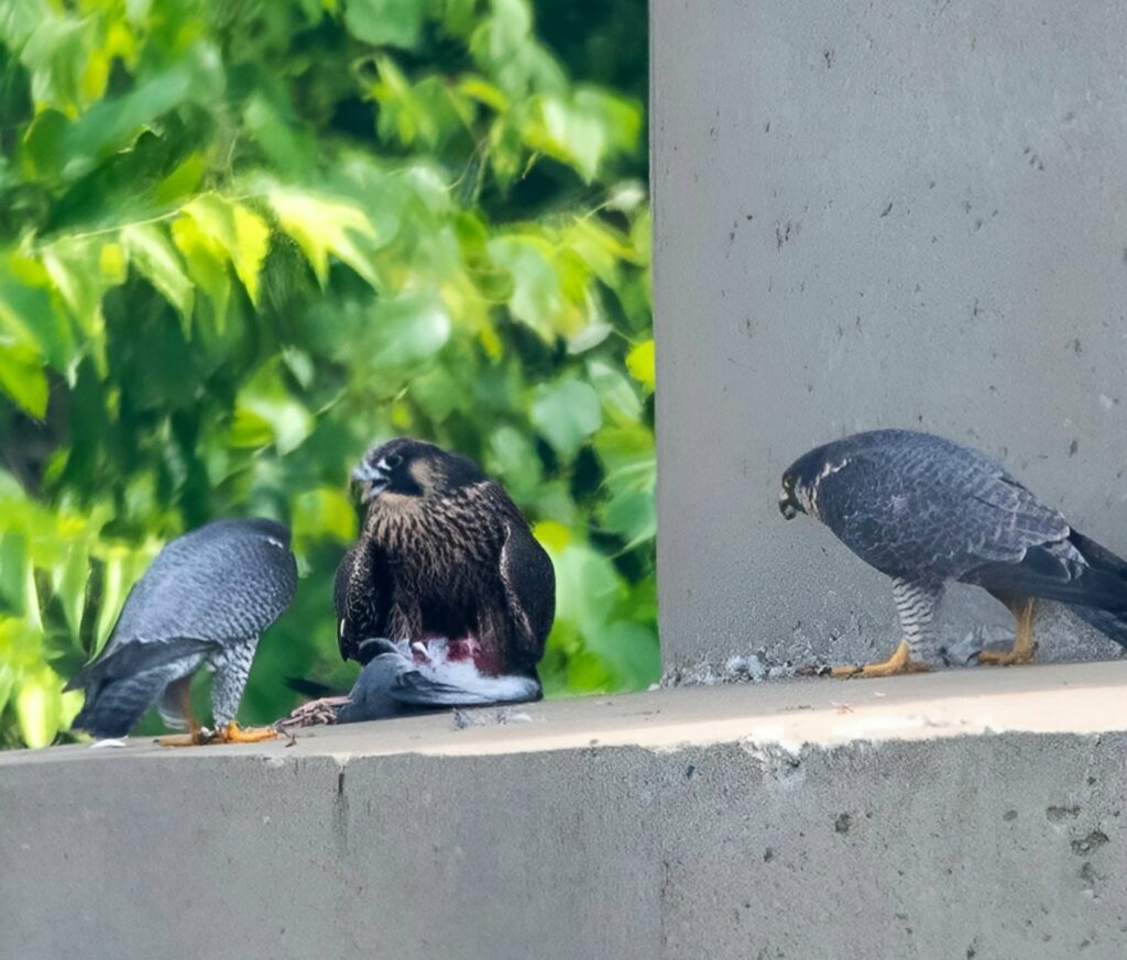 The fledging (center) receives a meal of pigeon, with her father (left) and mother (right).