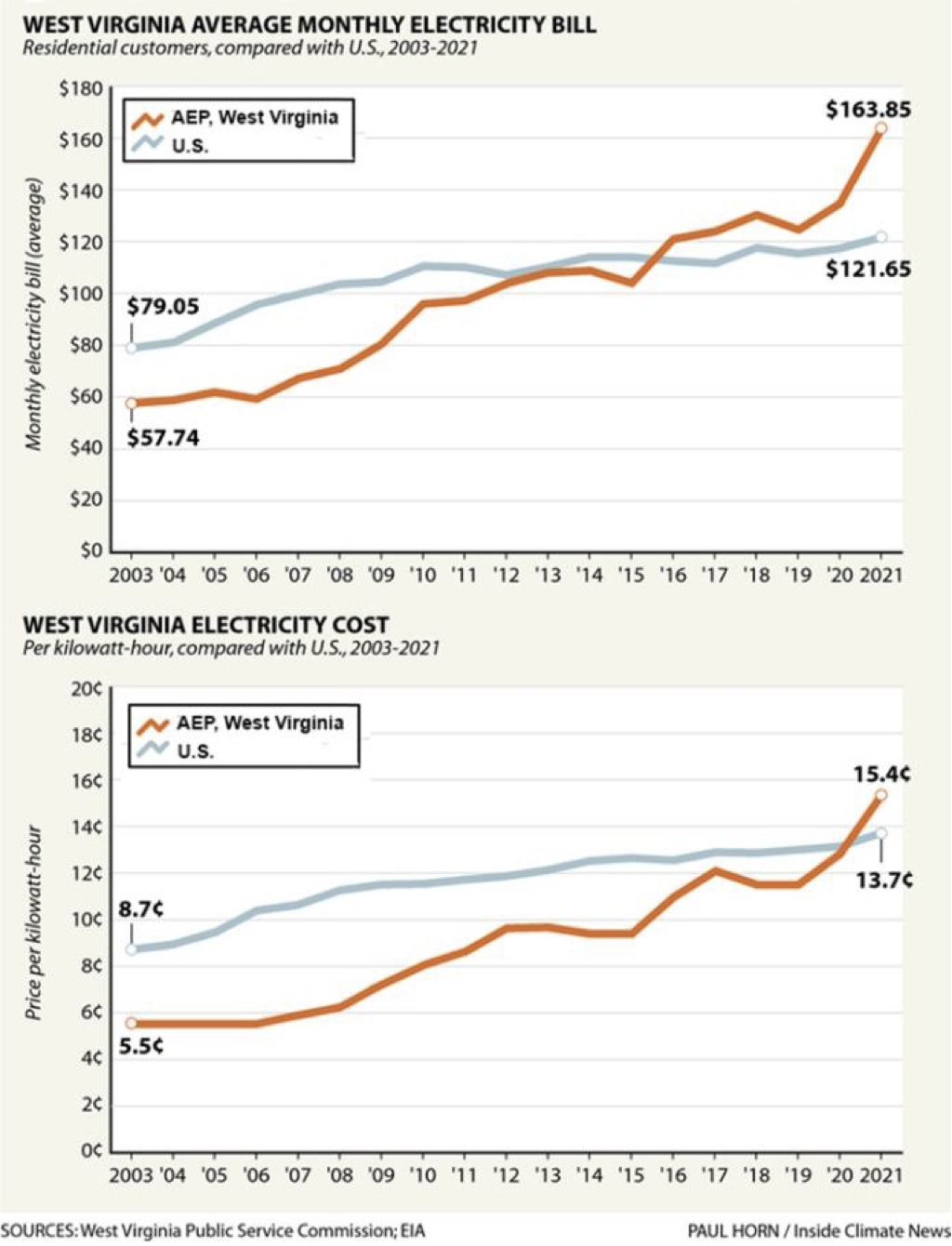 For the past dozen or so years, the PSC has failed miserably in its obligation to protect the interests of utility ratepayers. Rather, its decisions have uniformly favored the coal industry, and the utilities that burn coal to generate electricity. In 2008, West Virginia had the lowest average electricity rate in the country; by 2022, 17 other states had lower residential rates. Due to the pro-coal decisions made by the PSC since 2008, electricity prices in West Virginia increased at a rate that was five times the national average between 2008 and 2020. Figure 1 below, from a recent article in Inside Climate News, compares electricity prices and monthly bills for customers of American Electric Power (AEP) with the U.S. average since 2003. AEP is the parent company of Appalachian Power and Wheeling Power in West Virginia.