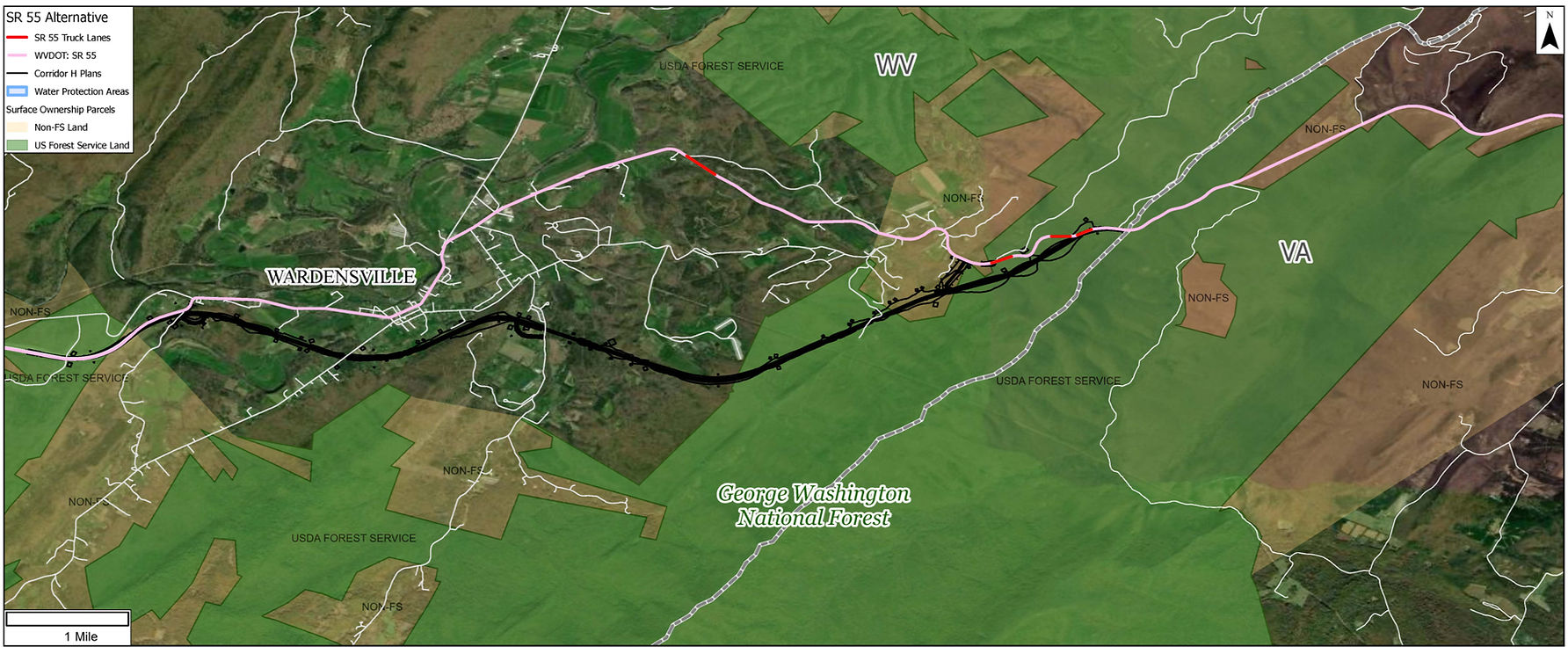 - If constructed, the four-lane highway would end just below the crest of Great North Mountain, where all eastbound traffic would be funneled onto Virginia’s much narrower, two-lane Route 55.