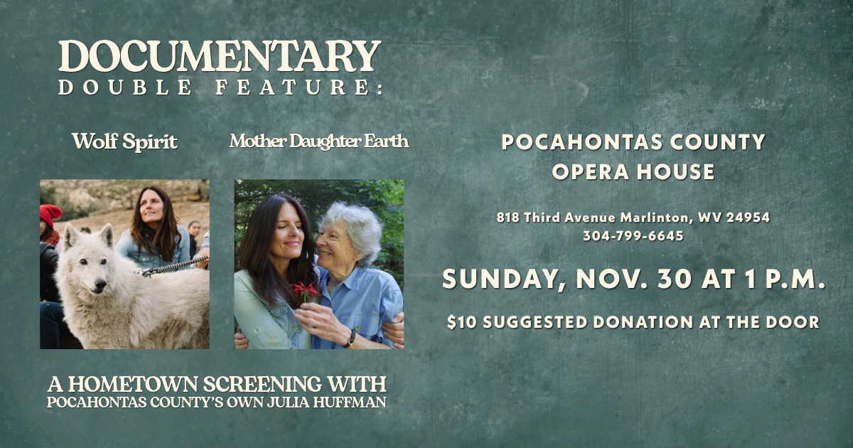 Join us at the Pocahontas County Opera House for a special documentary double feature featuring filmmaker Julia Huffman and her acclaimed short films Wolf Spirit and Mother Daughter Earth.