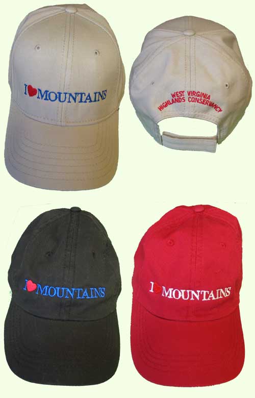 I heart mountains baseball style hats for sale. The colors are stone, black and red.. The front of the cap has I “HEART” MOUNTAINS. The heart is red. The red and black hats are soft twill, unstructured, low profile, sewn eyelets, cloth strap with tri-glide buckle closure. The stone has a stiff front crown with a velcro strap on the back. All hats have West Virginia Highlands Conservancy printed on the back.