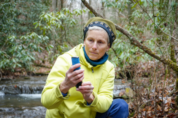 Mimi Kibler takes a stream water measurement at Dry Run on Sugarlands Rd. near Hambleton, West Virginia. In June 2022…